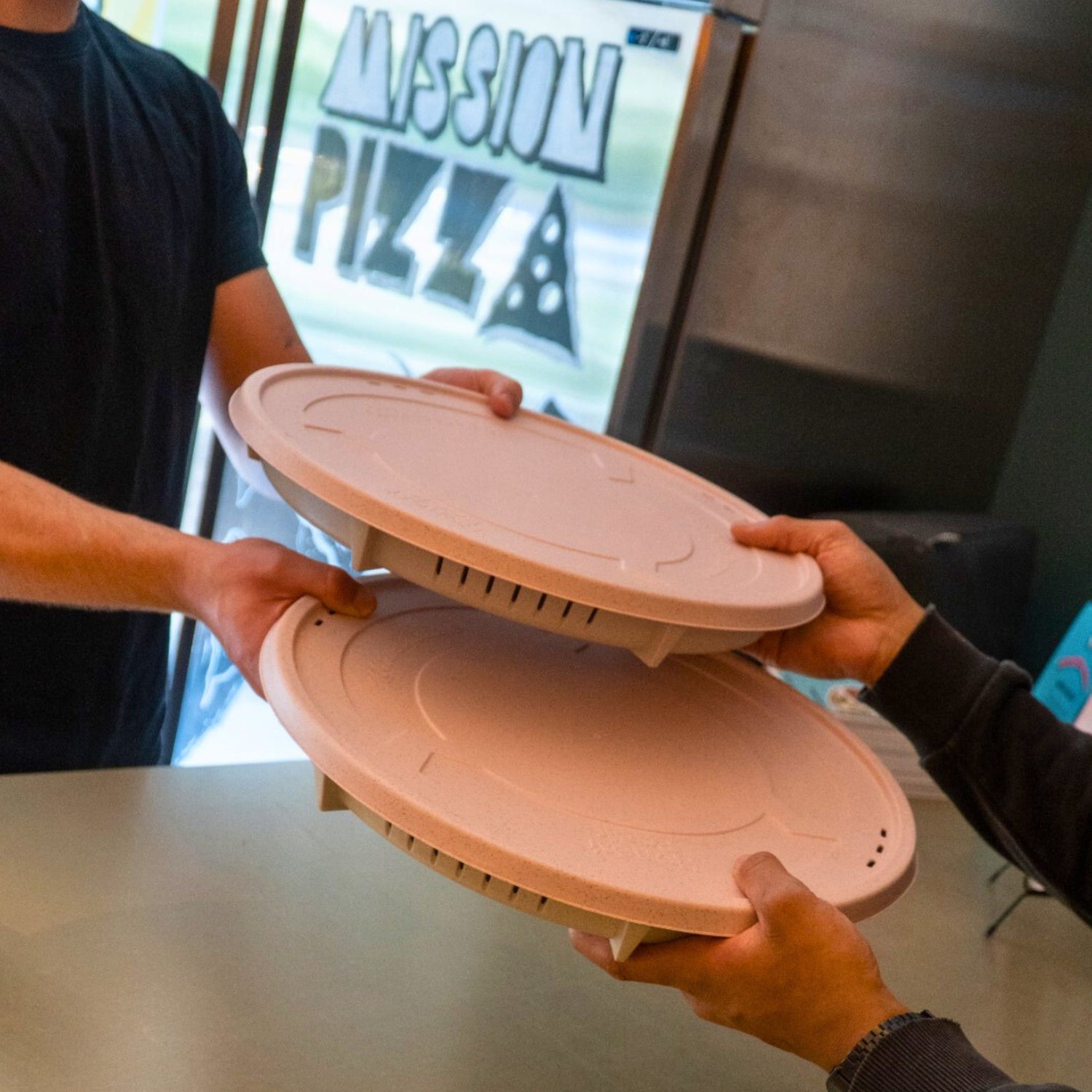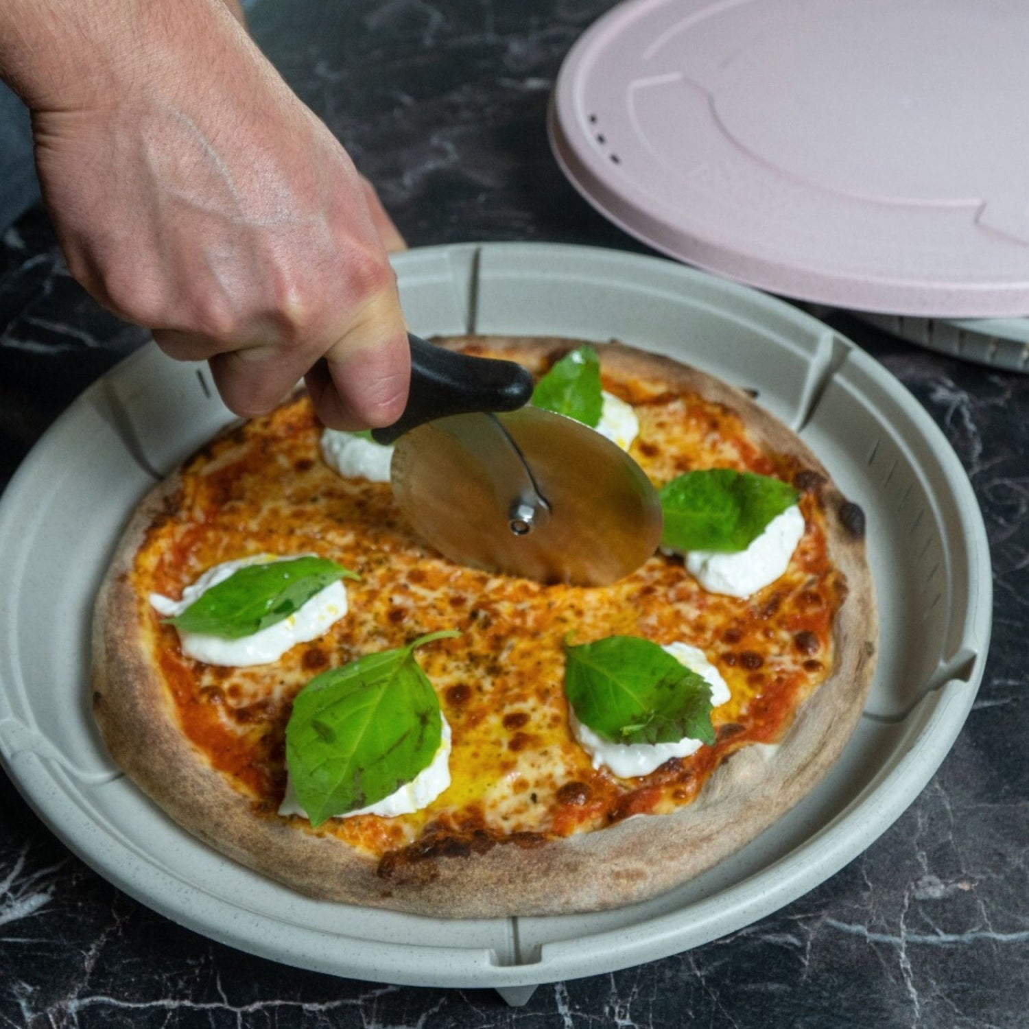 Convenient for consumers and pizzerias 5€ сash deposit, no QR codes or apps needed | Best-in-class pizza box made from biopolymer with 15% coffee husk, 100% recyclable | Non-scratch bottom structure with precision cutting guides | Stackable and place saving | Join the reusable movement
