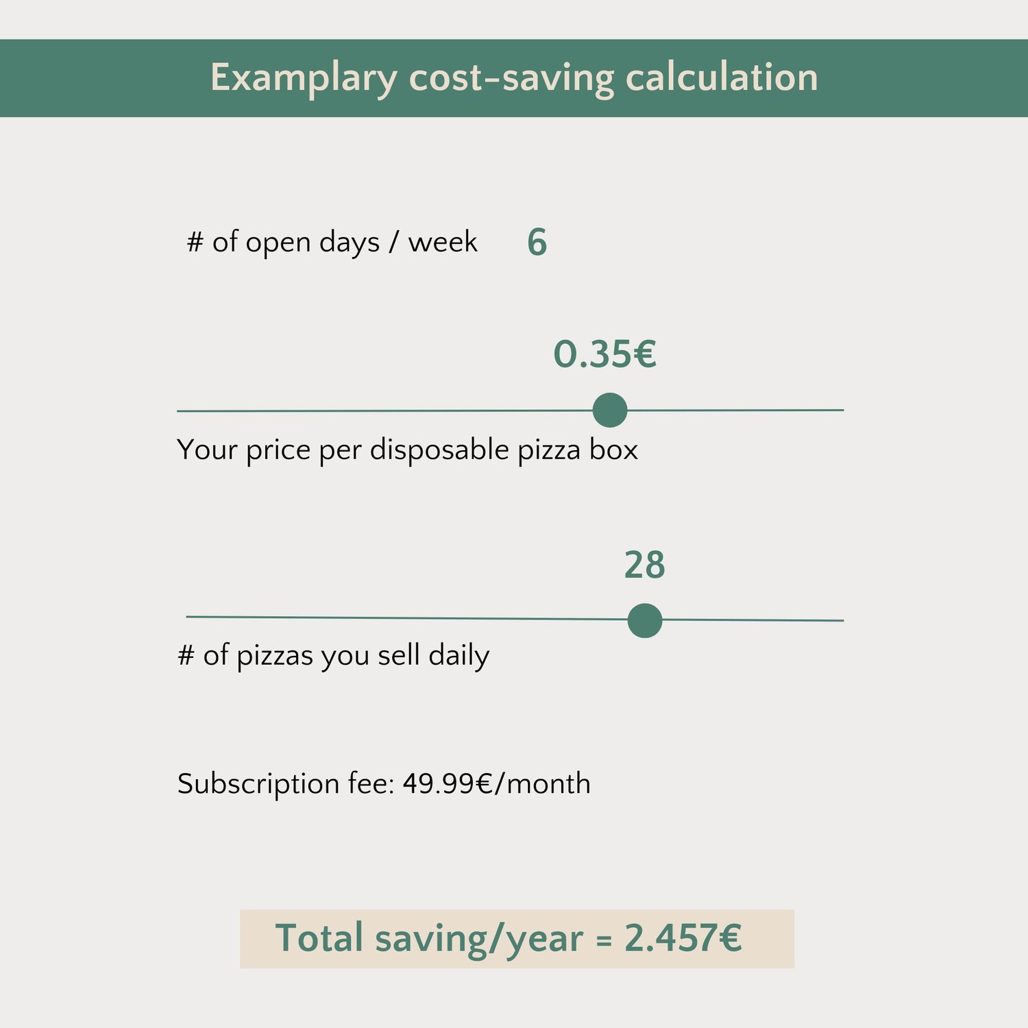- Save costs of disposable pizza boxes with a monthly subscription fee of 49.99€ after a test period.